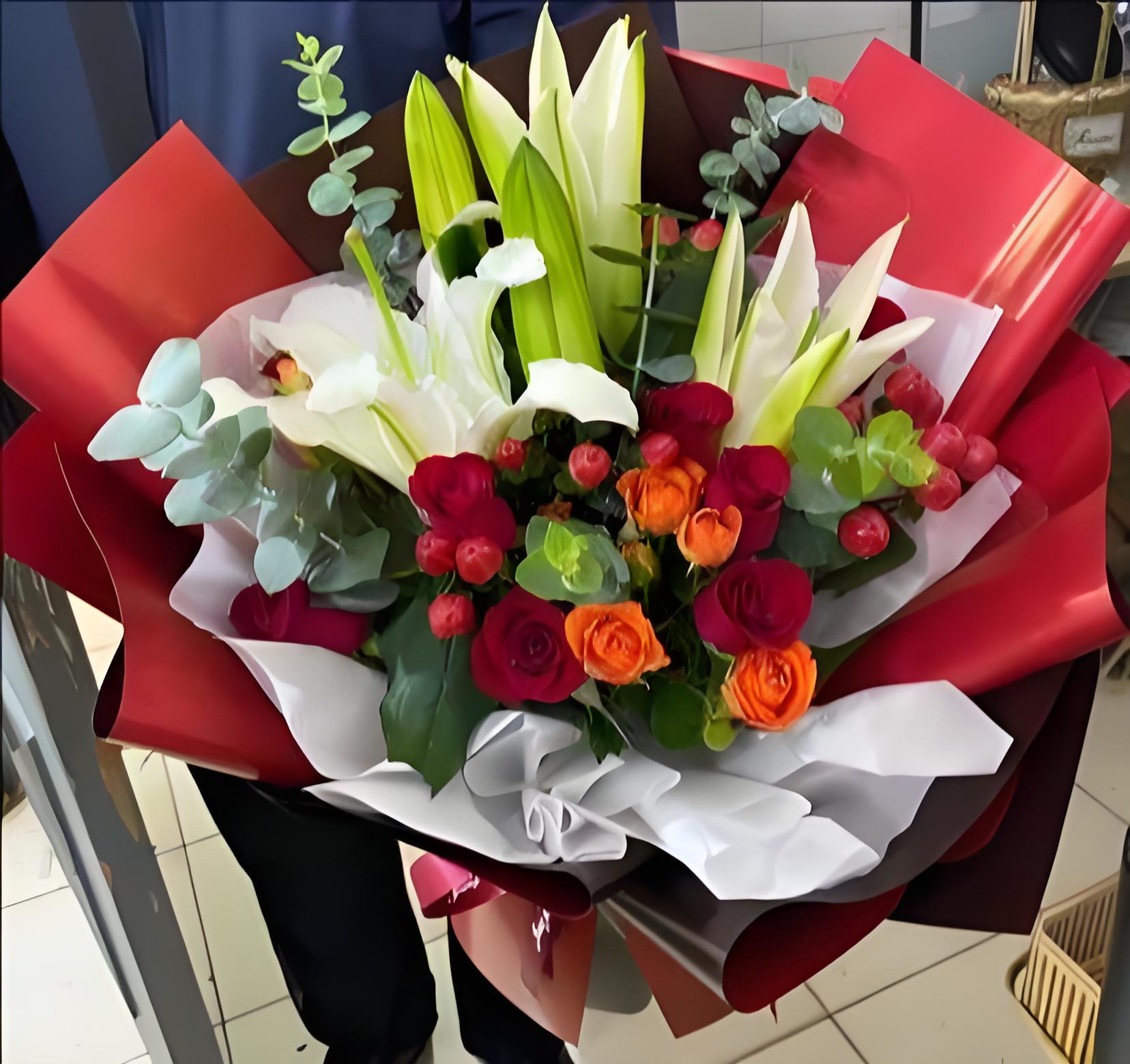 喀什花店包11枝红玫瑰、2枝多头白百合、6枝橙色多头玫瑰、红豆、尤加利叶